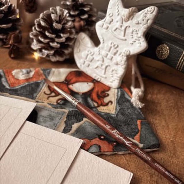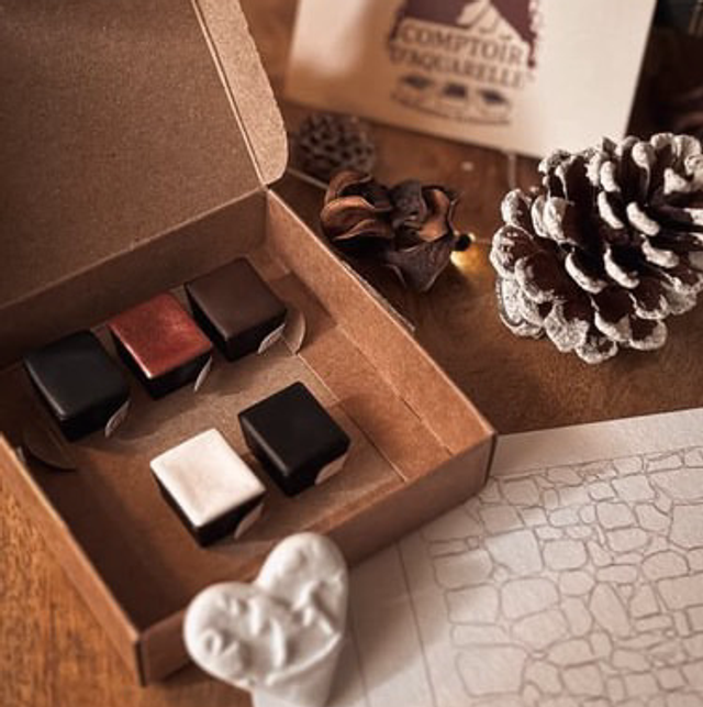 Dans la petite box, vous retrouverez les 3 planches de coloriage créer par Manon spécialement pour ce projet, un set de mini godets (1/8 de godet), un pinceau aquarelle Raphaël 4 ou 5 et une décoration de Noël offerte (en forme de hérisson)